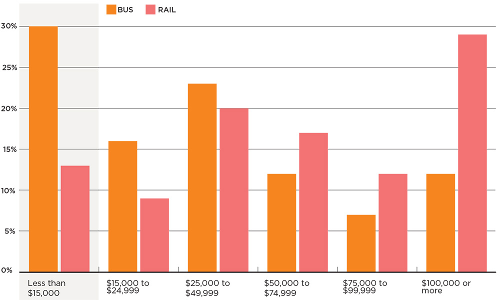 Thirty percent of households making less than $15,000 report riding the bus; high-income households making more than $100,000 are more likely to take the train.