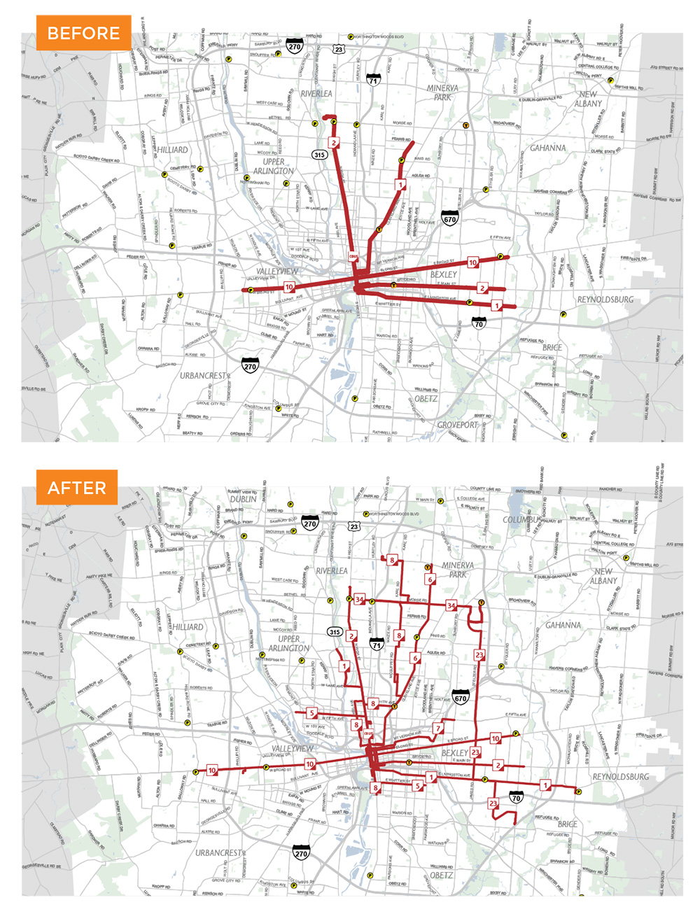 The city's bus network redesign (bottom map) added new, high-frequency routes that make connections easier.