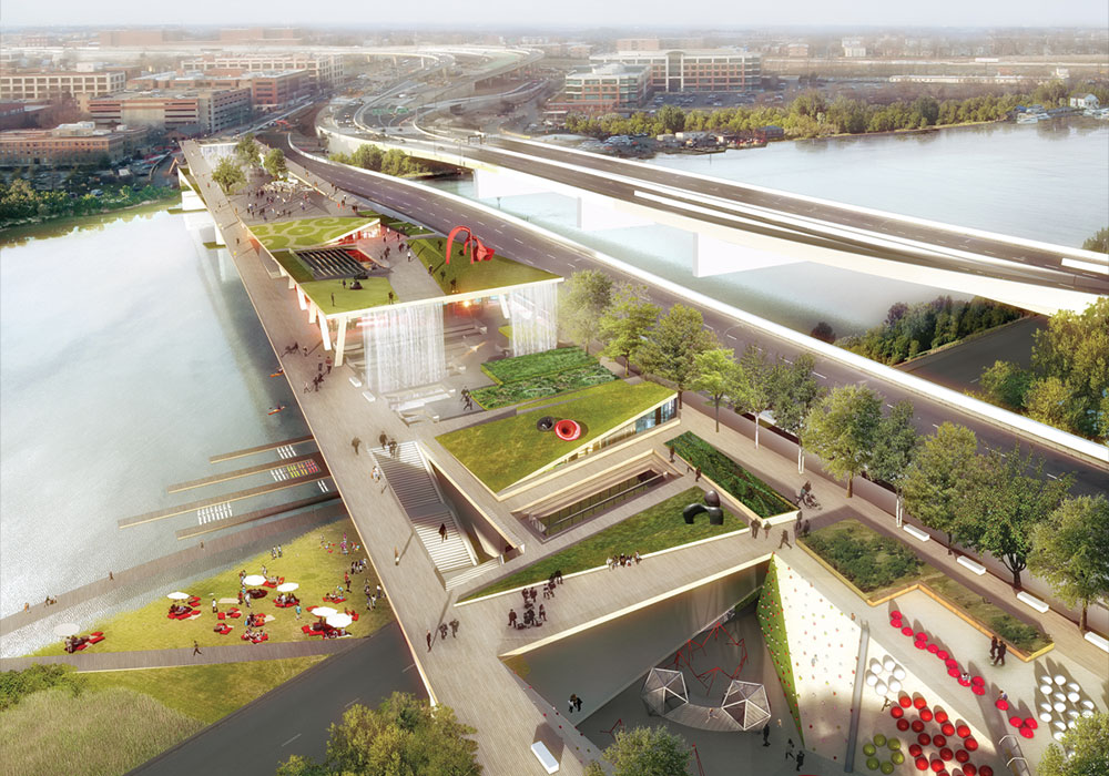 11th Street Bridge Park includes a few unusual features, drawn largely from input of the community: new pedestrian and public spaces, a cafe, an environmental education center, a public amphitheater, and even a dramatic waterfall. Many of these constituent elements will be run through long-term agreements with other local organizations. The environmental education center, for example, will be run by the Anacostia Watershed Society, a local environmental group with a deep history of working in the area. The urban farm will be run by the University of the District of Columbia, which has been working hard on developing a network of community food hubs throughout D.C.