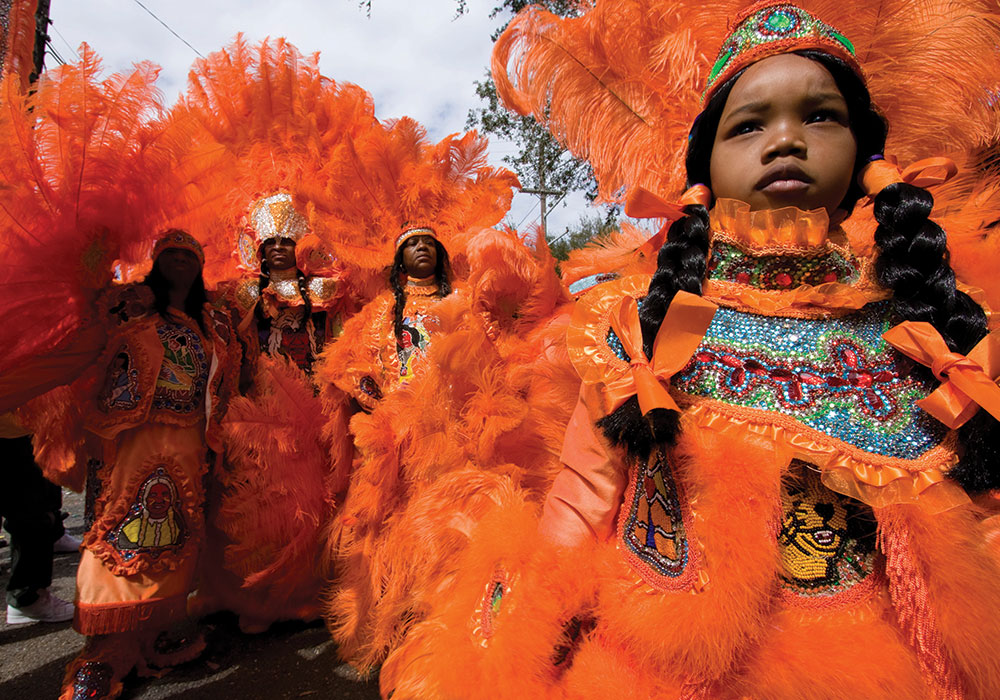 One of the Mardi Gras Indian tribes at a Fat Tuesday parade. "Orange Feather Costume" by Derek Bridges, Flickr (CC BY 2.0).