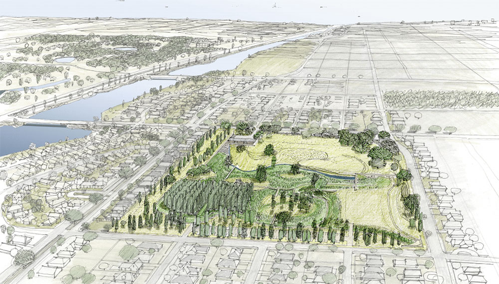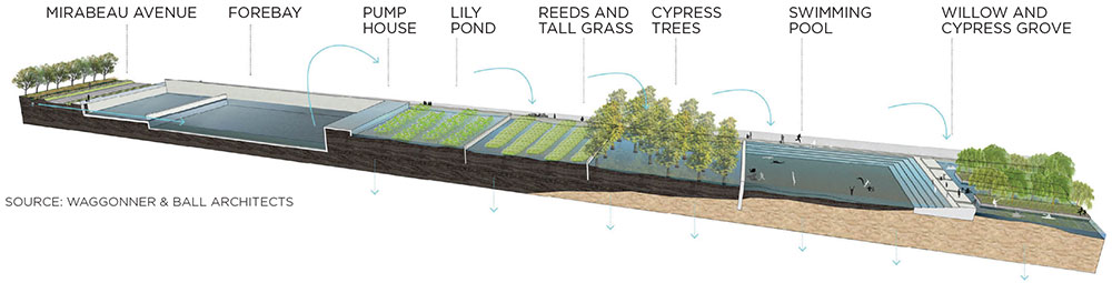 Mirabeau Water Garden, one of several demonstration projects outlined in the water plan and one component of the Gentilly Resilience District, will work with water rather than fight it — combining the design features of a 25-acre city park (this rendering shows it during a dry period) that is also a natural filtration system to mitigate floods. Neighborhood-scale initiatives will also allow home owners to floodproof their homes.