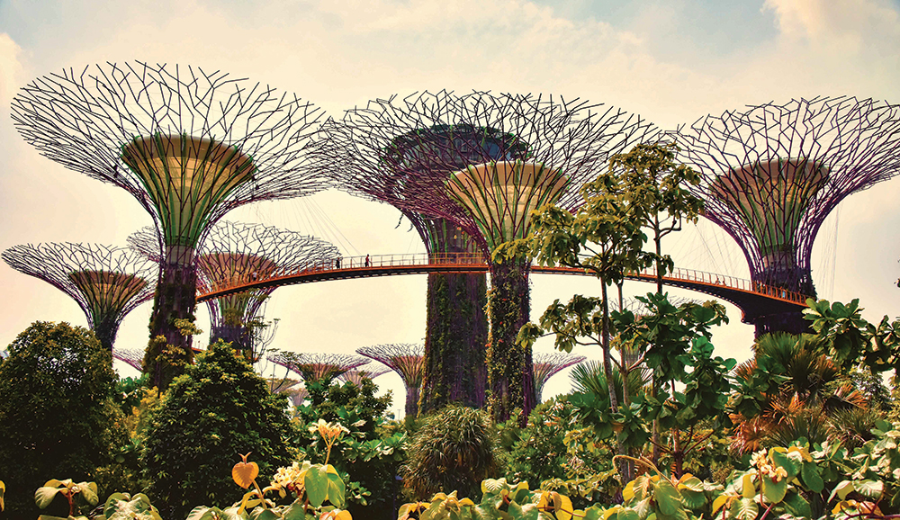 For a closer look at Singapore's Gardens by the Bay — and its innovative feat of hybridized nature, the supertrees grove — go to youtu.be/5UhnuddcAsE. "Supertrees, Singapore" by Rod Waddington, Flickr (CC BY-SA 2.0).